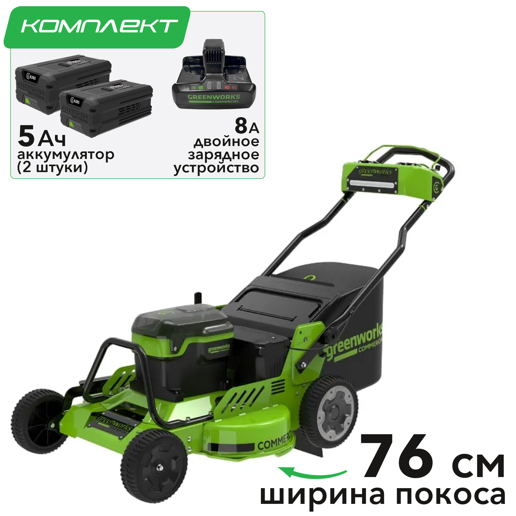 Газонокосилка самоходная 76 см, бесщеточная, аккумуляторная Greenworks 82V (арт. 2519207) поставляется в комплекте с двумя аккумуляторами на 5 А*ч и двойной зарядкой.
