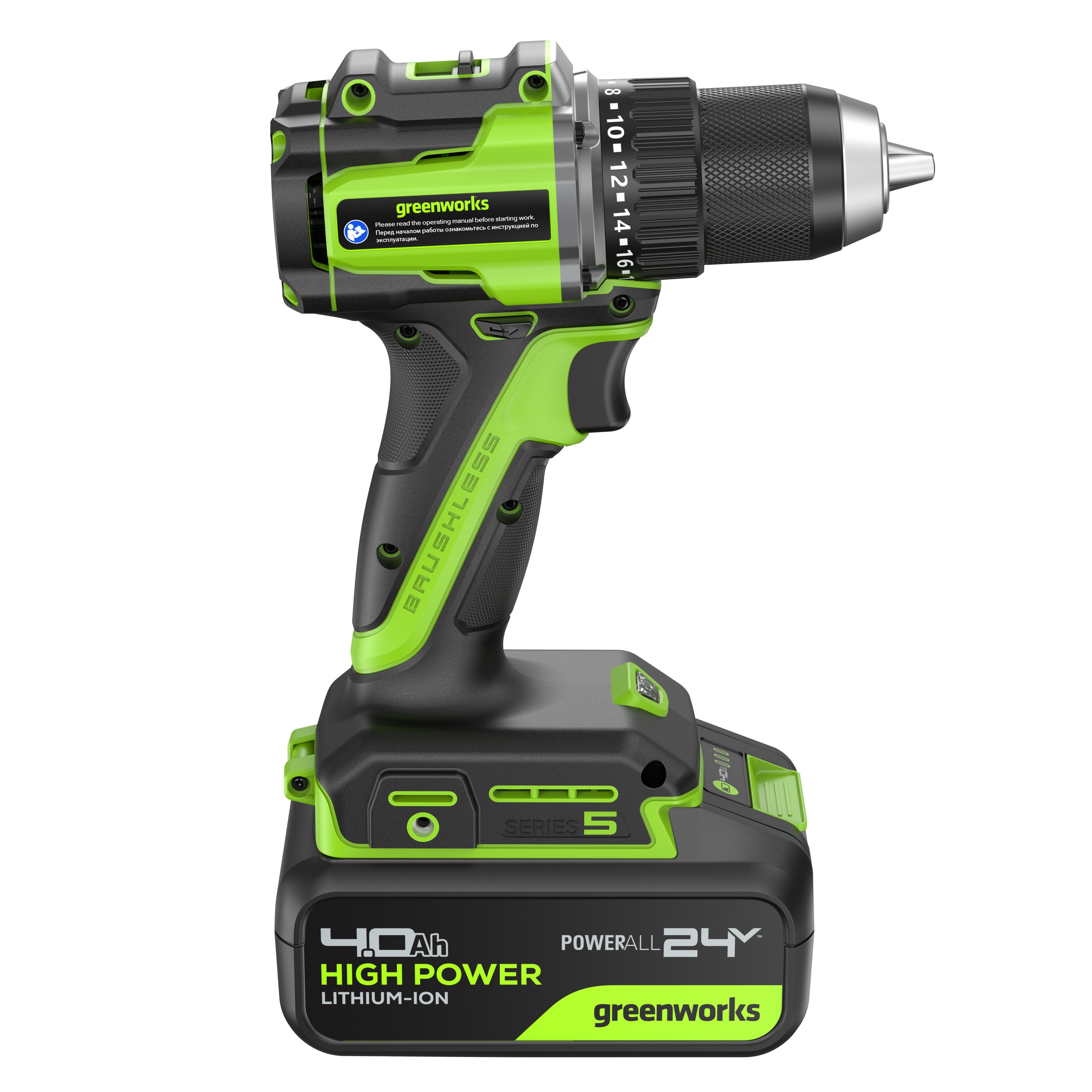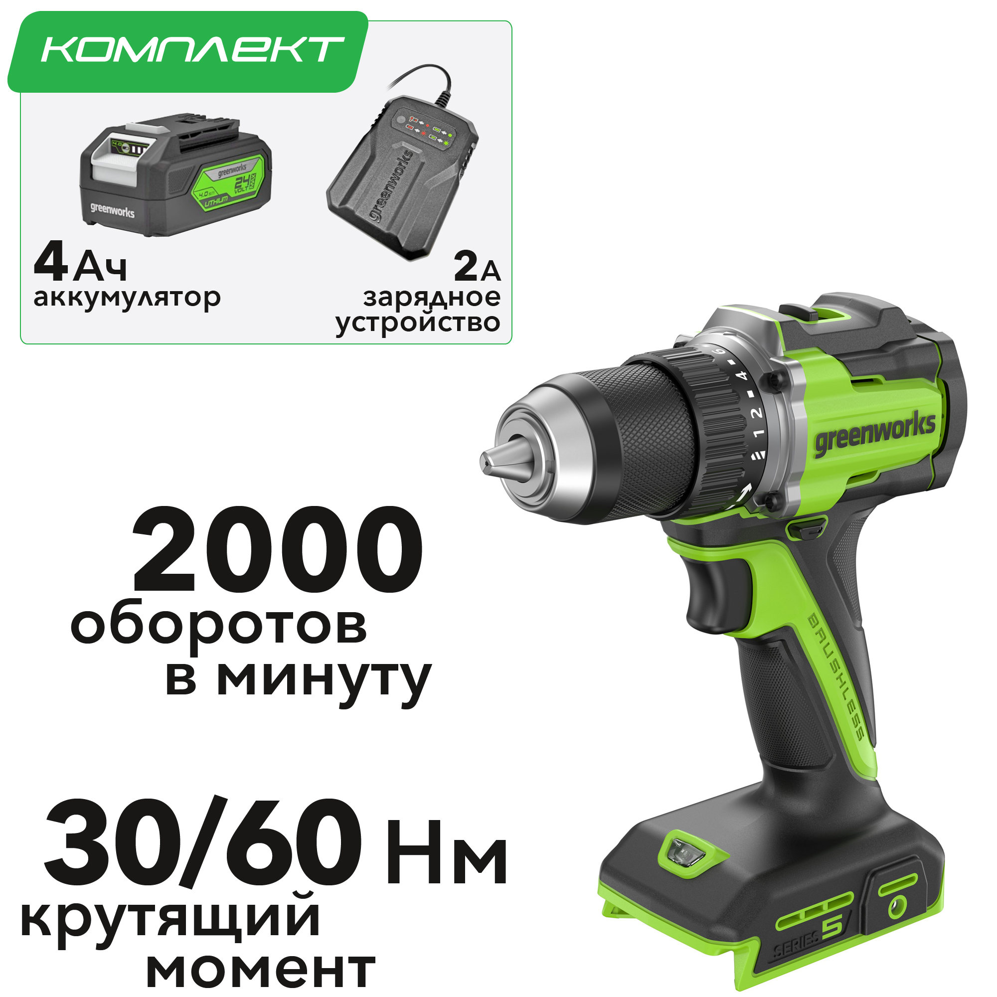 - Дрель-шуруповерт 30/60 Нм бесщеточная аккумуляторная Greenworks 24V DD560 (арт. 3708407)