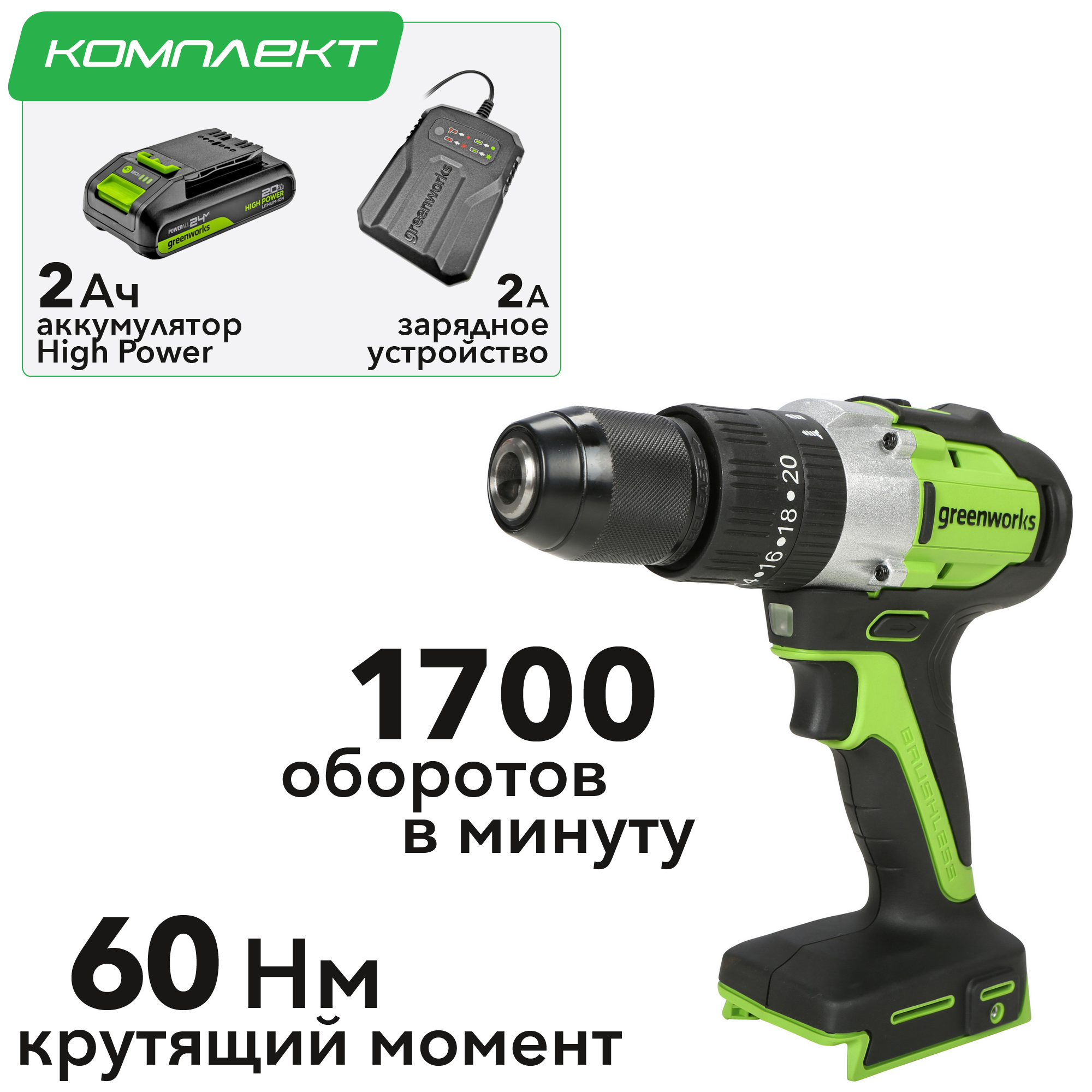Аккумуляторная дрель Greenworks GD24DD60 – новинка конца 2020 года! Высокопроизводительный электроинструмент, предназначенный для закручивания и откручивания шурупов, а также для сверления отверстий в металле, пластике, дереве и прочих материалах. Данная модель имеет быстрозажимной патрон, что позволяет использовать шуруповёрт в качестве дрели, вставив в патрон сверло.
