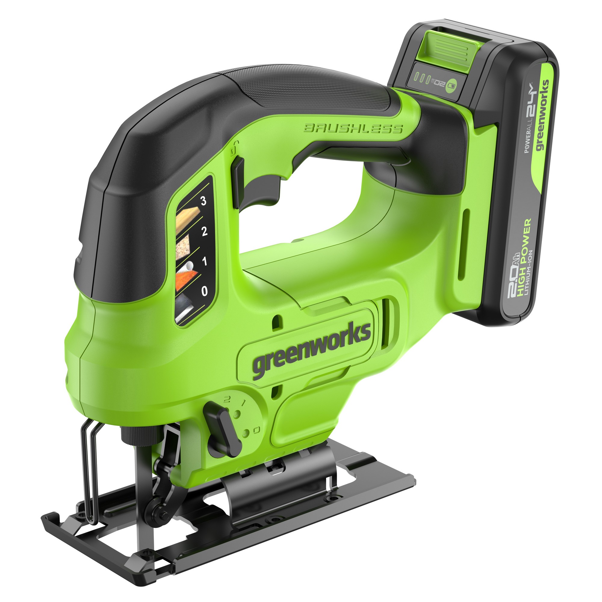 Аккумуляторный лобзик Greenworks GD24JS90 24V (арт. 3601707) – инструмент с частотой хода до 3000 в минуту. Глубина реза в дереве 90 мм, стали 10 мм.