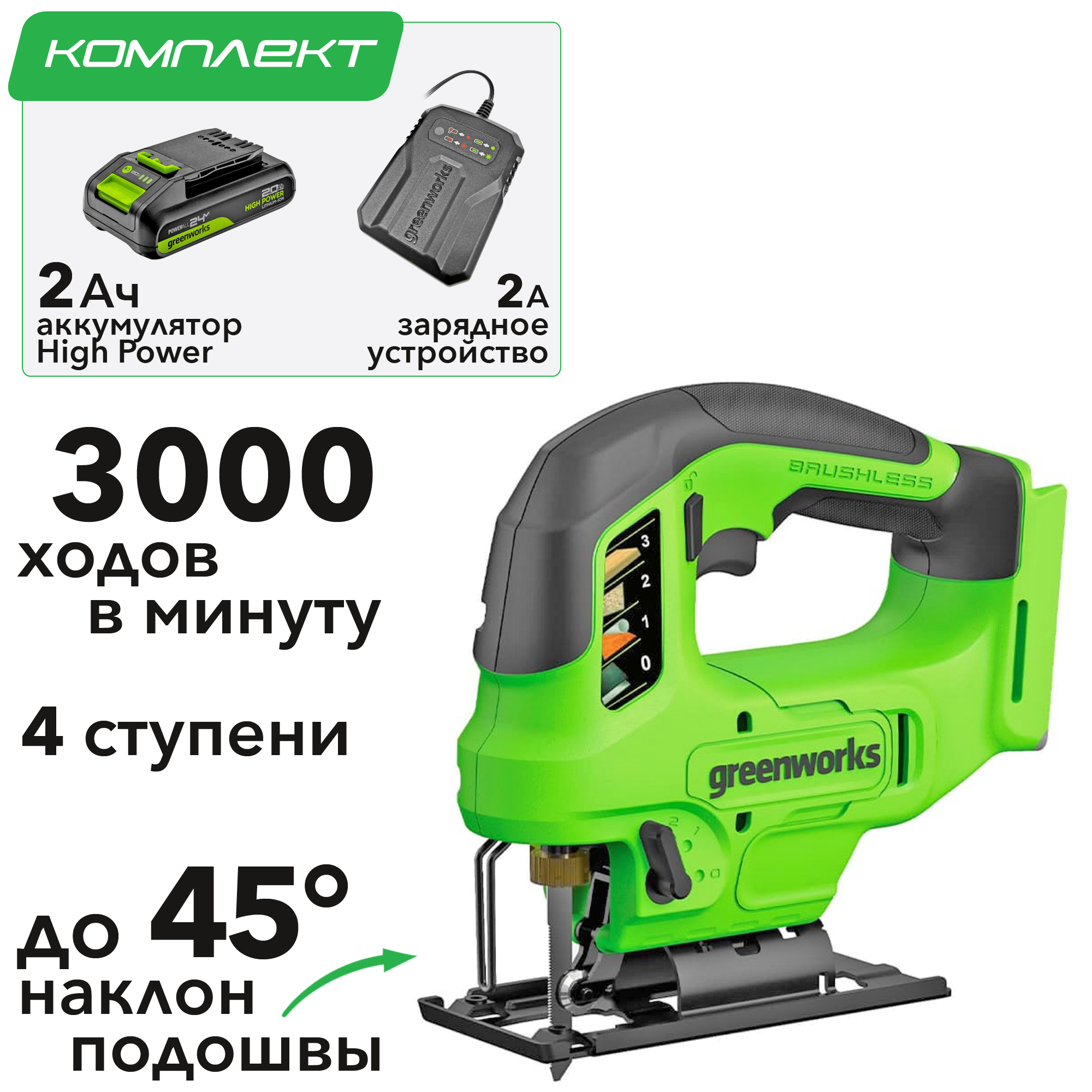 - Аккумуляторный лобзик Greenworks GD24JS90 (арт. 3601707)