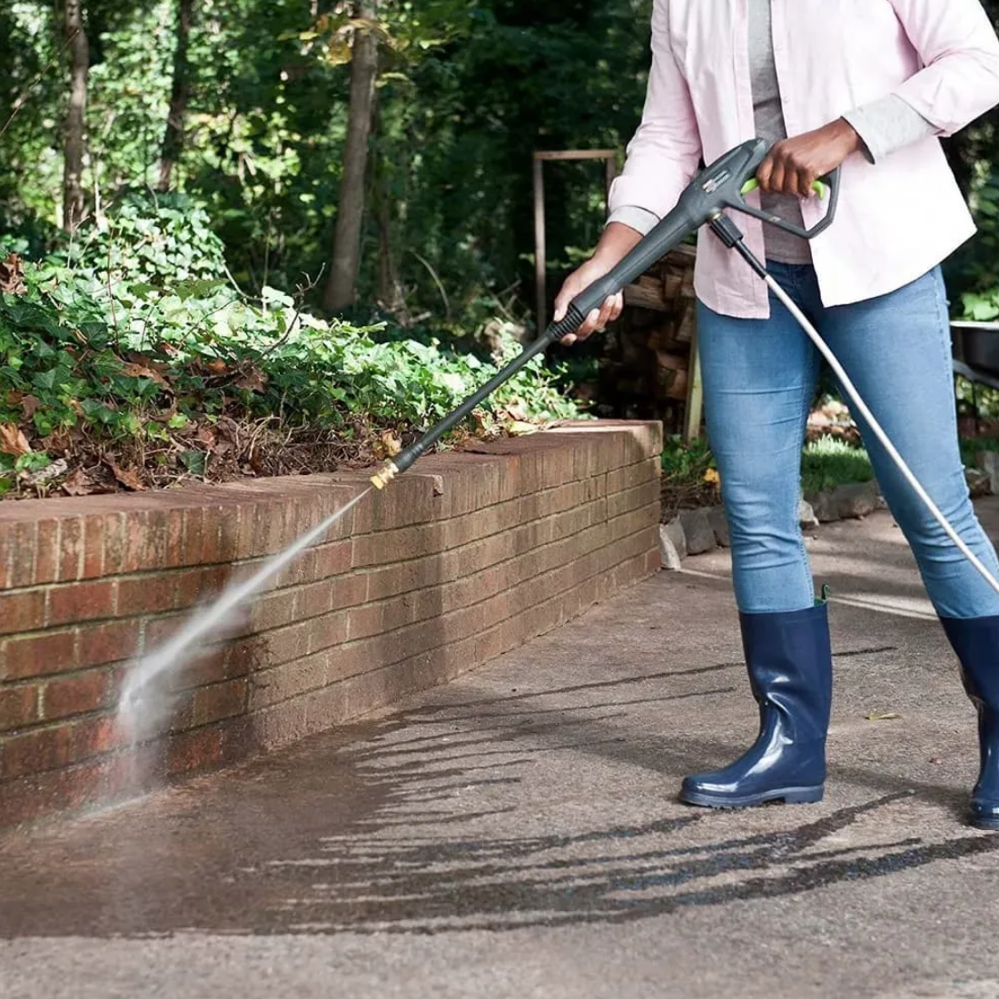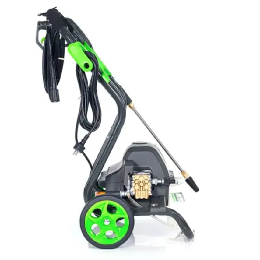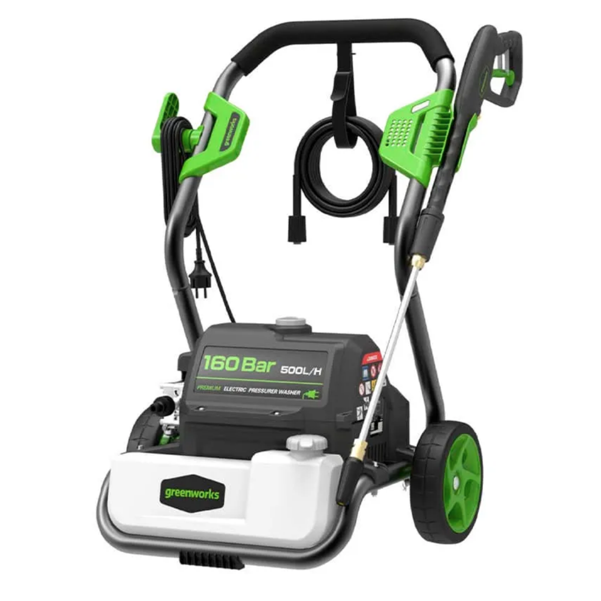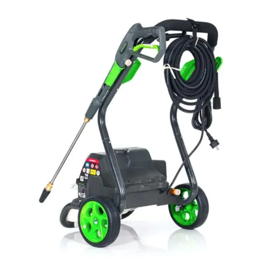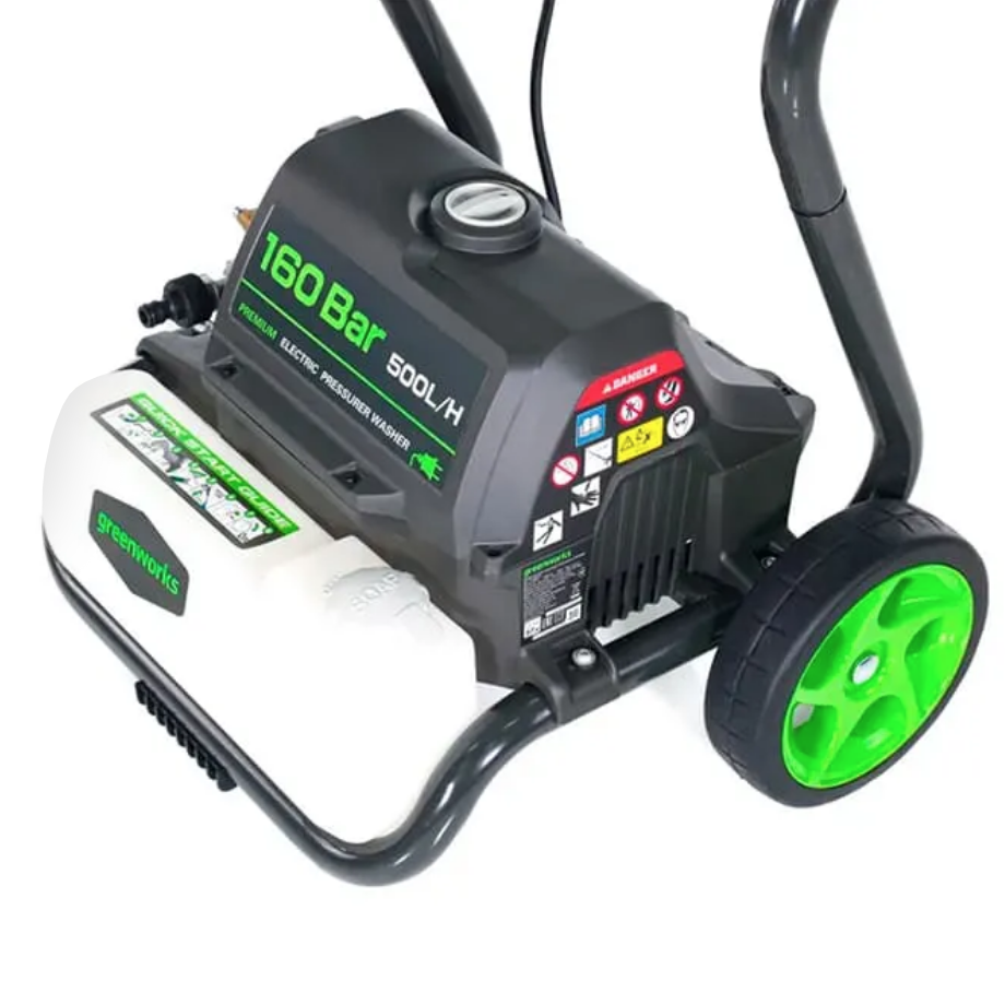 Мойка смонтирована на прочной раме и оснащена большими колесами диаметром 20 см для удобства перемещения. Пистолет, насадки, а также шланг высокого давления и электрический кабель крепятся на ручке рамы и всегда будут под в доступности. Насадки имеют универсальное быстрое крепление 1/4 дюйма и взаимозаменяемы для моек Greenworks.