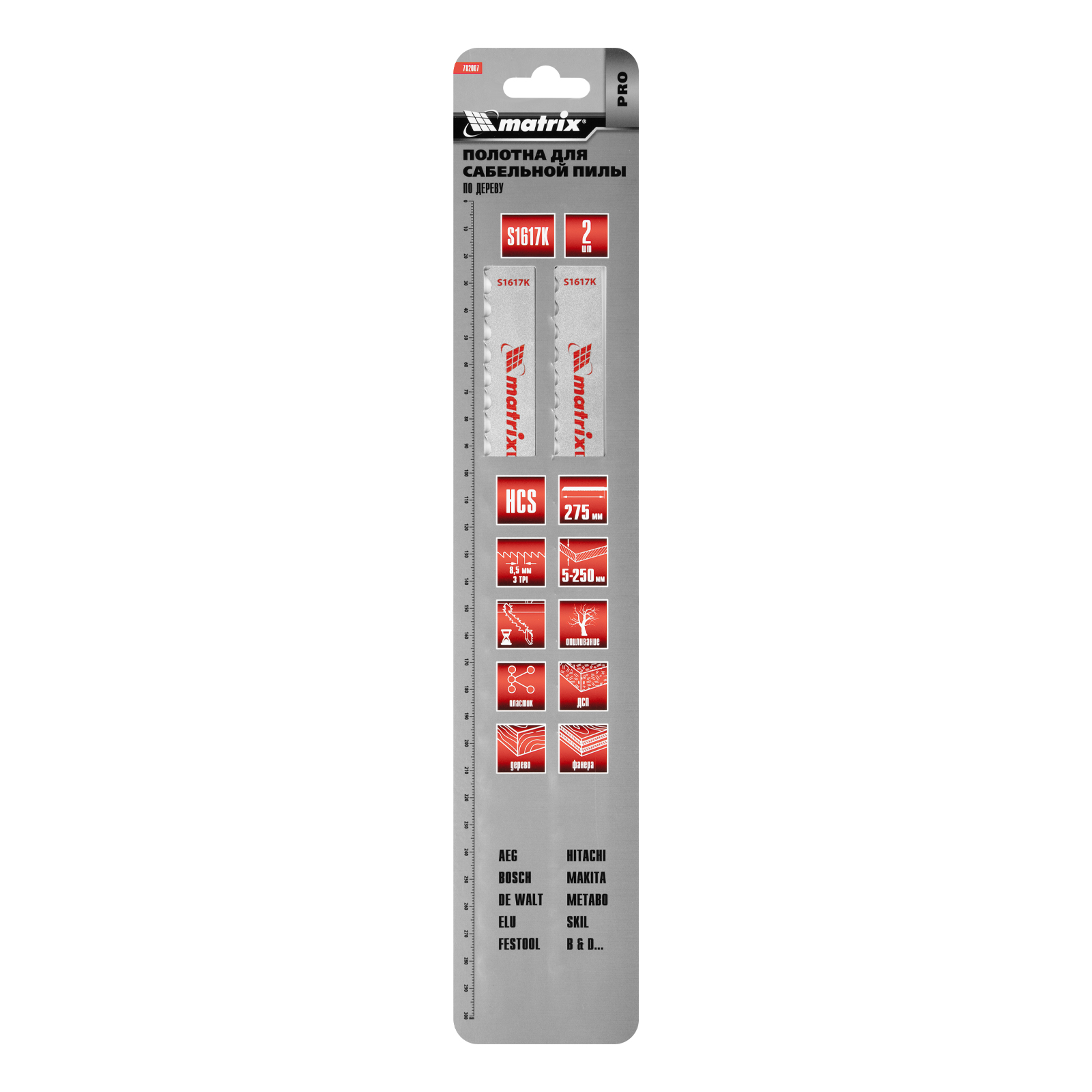Полотна по дереву Matrix S1617K PRO 782007 с рабочей длиной 275 мм и шагом зубьев 8,5 мм, из стали HCS, 2 шт. в упаковке, — оснастка для сабельной пилы. Применяются для работ по дереву, фанере, ДВП, ДСП, пластику. Толщина пропила составляет от 5 до 250 мм. Полотна позволяют производить прямой быстрый рез. Универсальные хвостовики совместимы с сабельными электропилами ведущих производителей. Изделия будут полезны во время строительства, ремонта, а также пригодятся для работы на дачном участке.