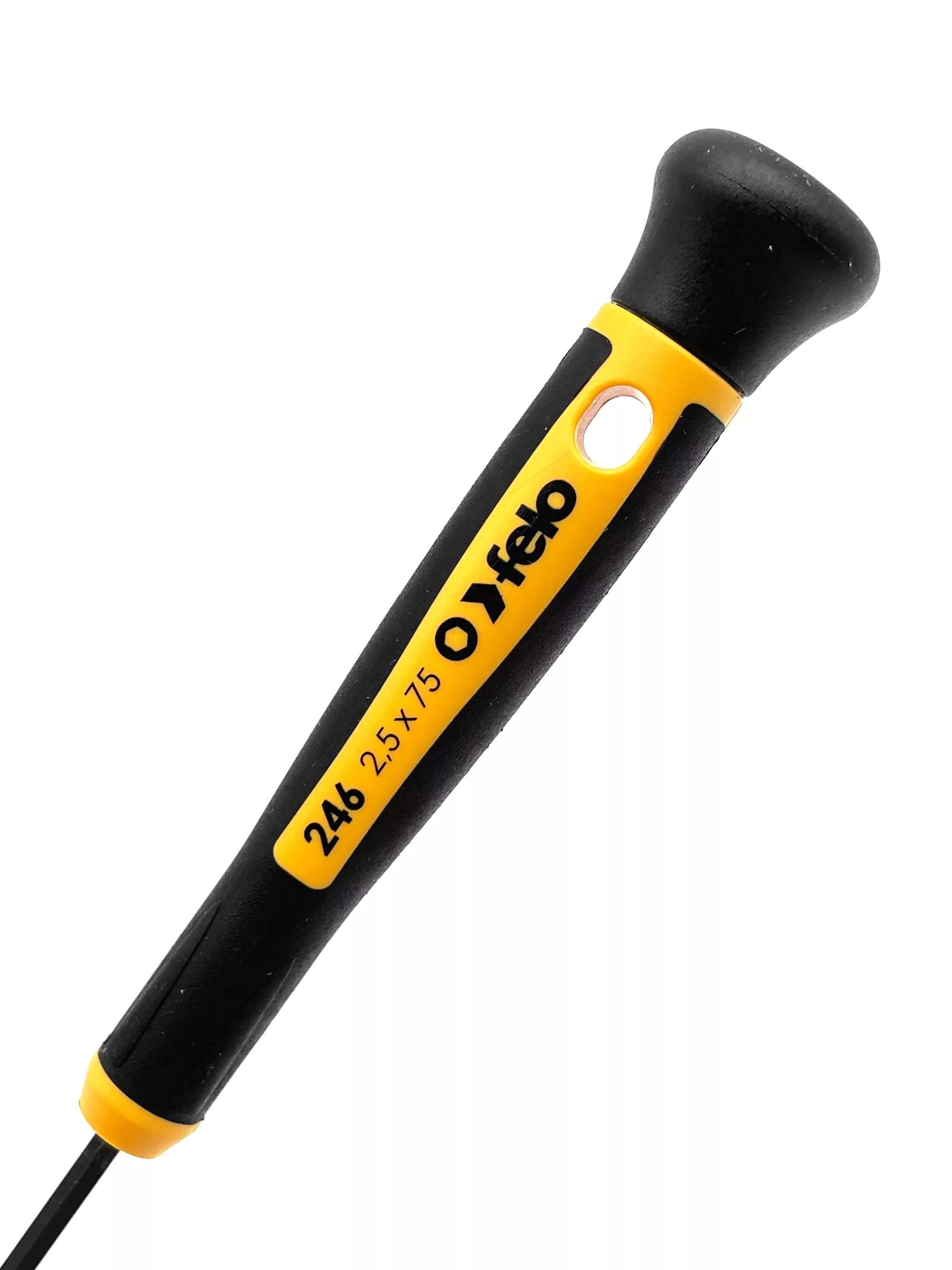 Отвертка шестигранная для точных работ HEX 2,5х75 идеально подходит для ремонта оргтехники, ноутбуков, телефонов и очков. Стержень отвертки, проходящий по всей длине рукоятки, изготовлен из хром-молибден-ванадиевой стали, закаленной в масле, что делает инструмент более долговечным по сравнению с обычными отвертками. Рукоятка выполнена по технологии двухкомпонентной ручки с мягким внешним покрытием для дополнительного комфорта. Свободно вращающийся колпачок минимизирует трение. В рукоятке имеется отверстие для удобного хранения инструмента. Страна производства - Германия. Гарантия на инструмент 15 лет.