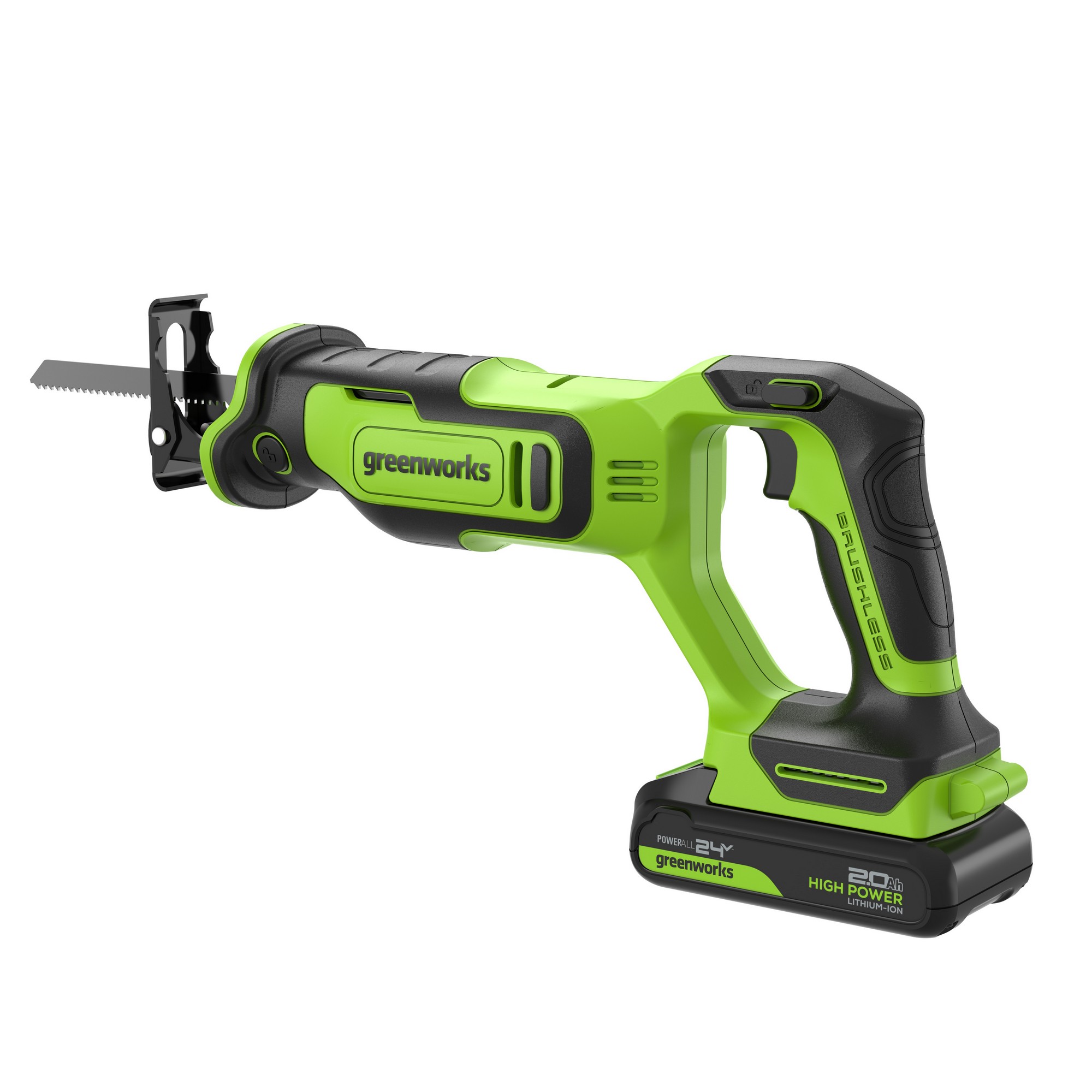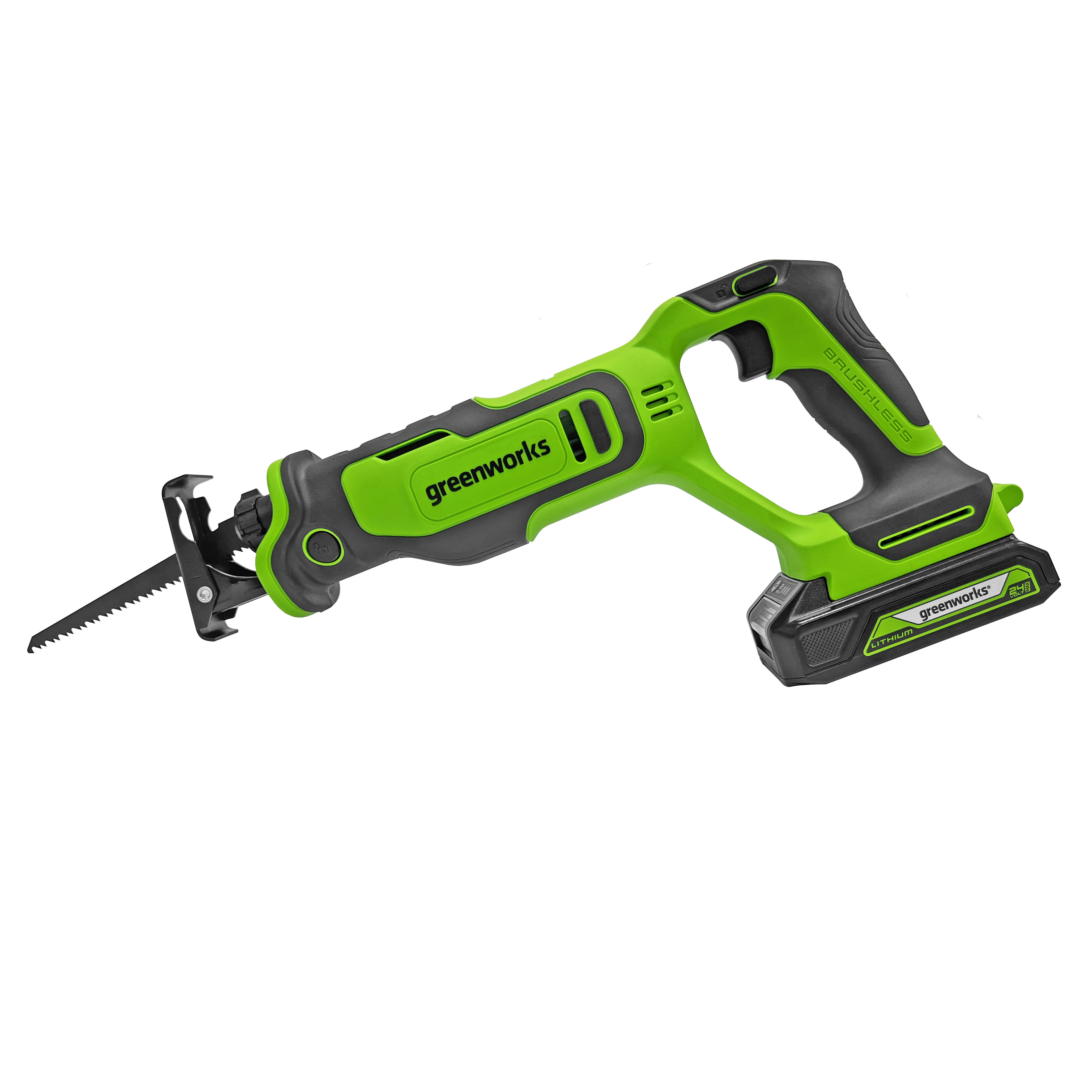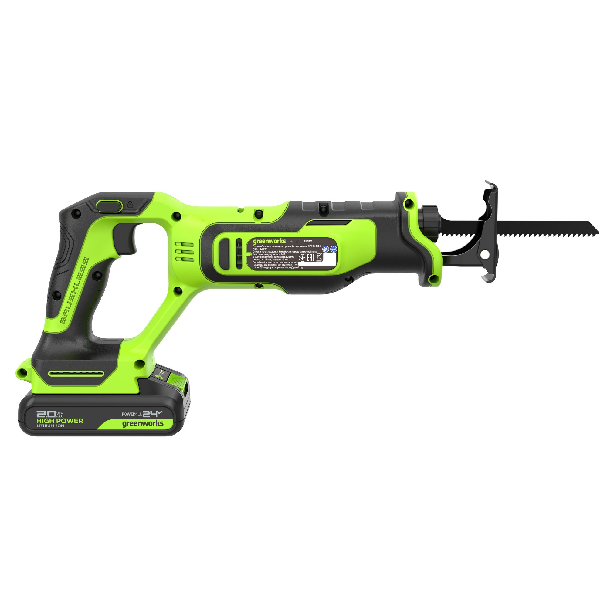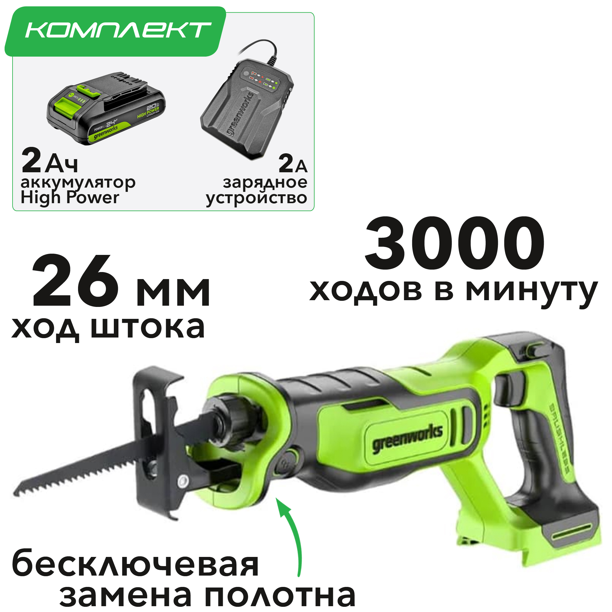 Видео обзор сабельной пилы Greenworks 24V GPT-BLRS-1Пила сабельная компактная аккумуляторная Greenworks 24V GPT-BLRS-1, бесщеточная 1200607CUA поставляется в комплекте с аккумуляторной батареей на 2 А*ч и зарядным устройством.