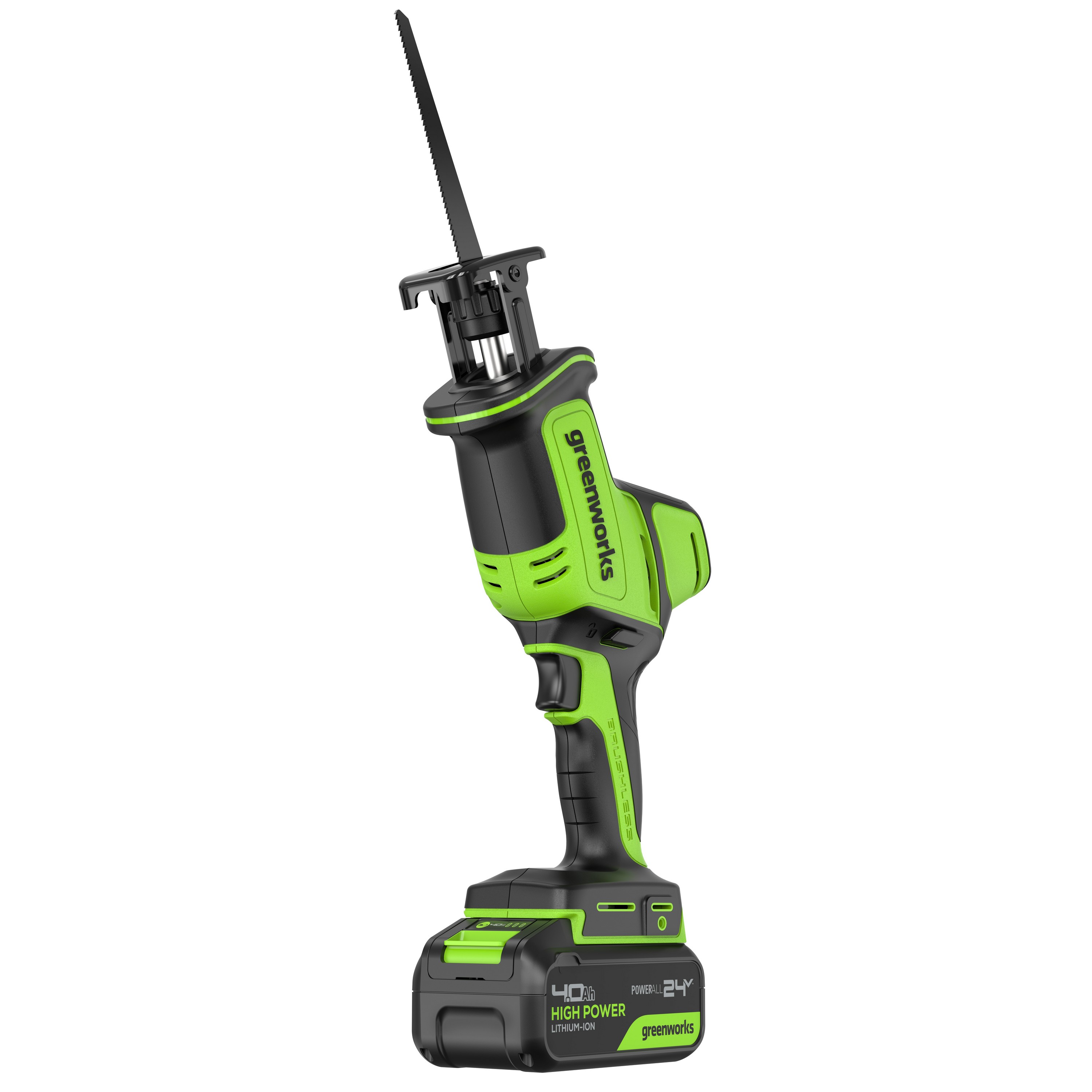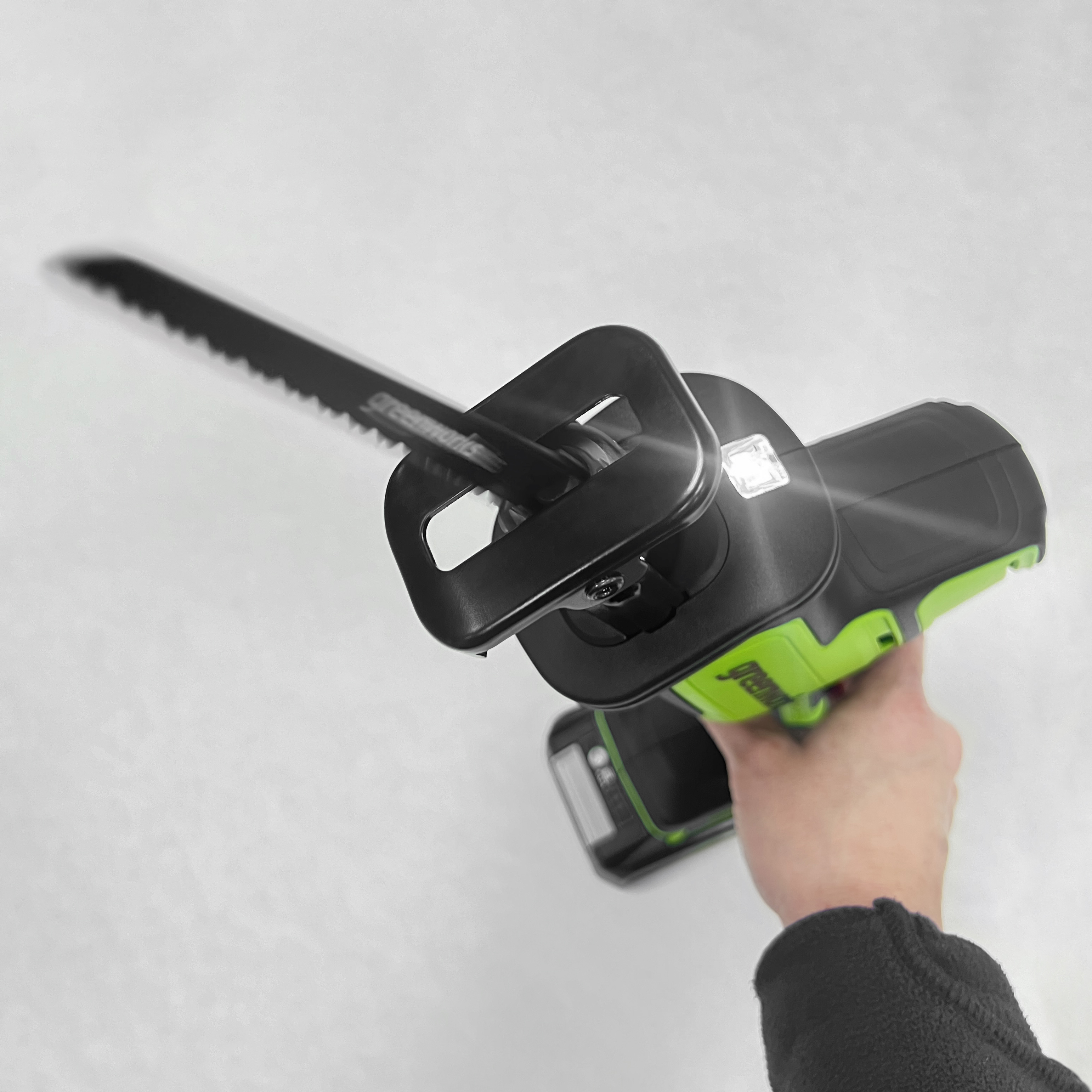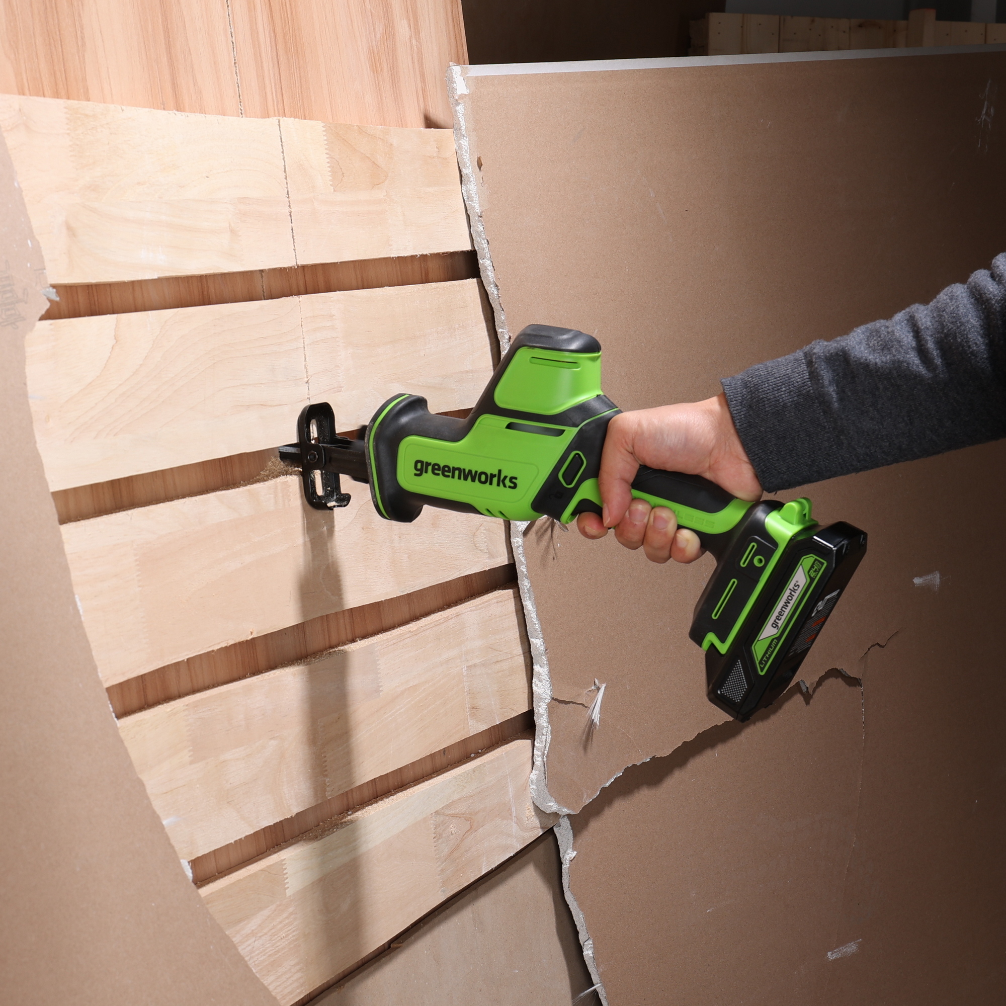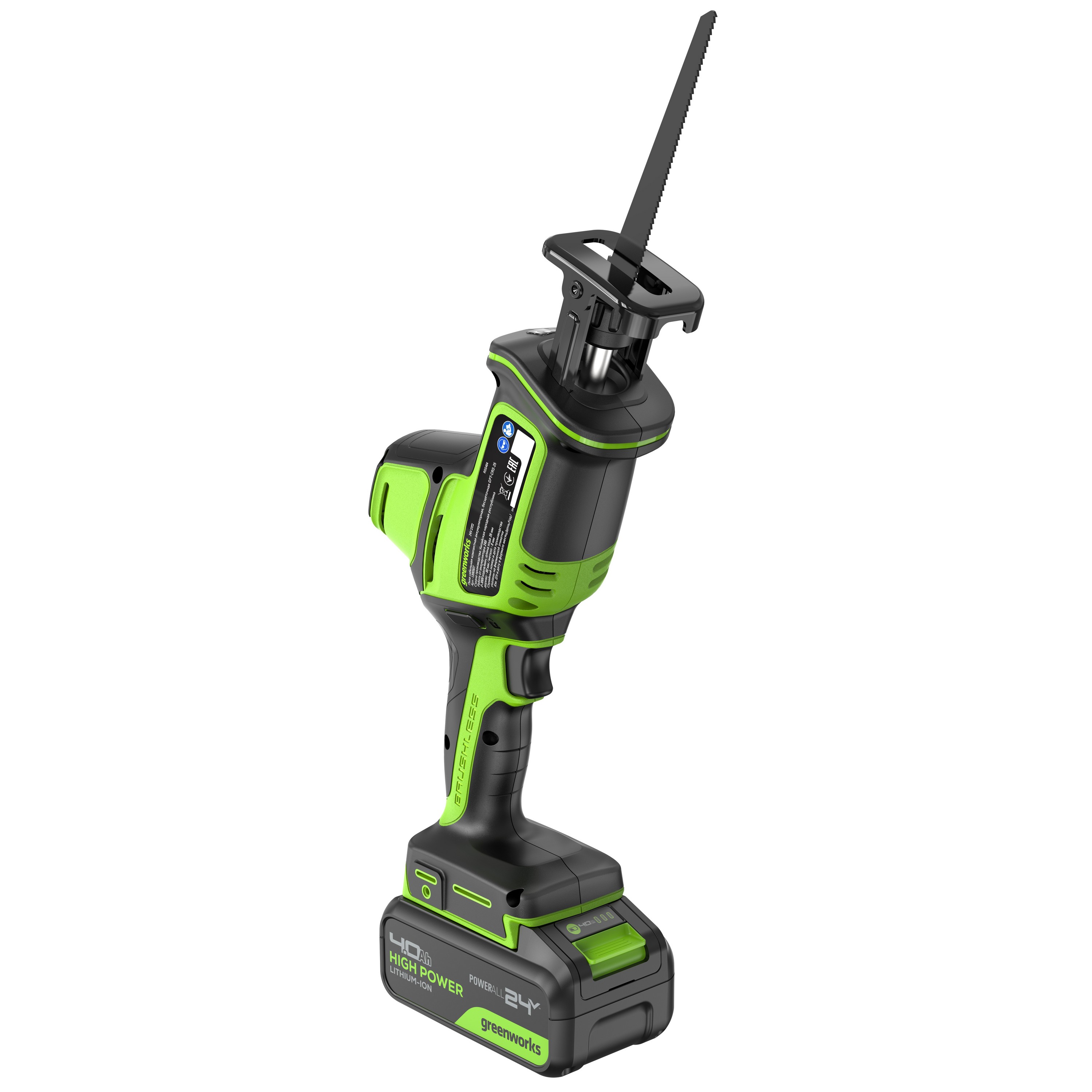 Видео обзор сабельной пилы Greenworks GPT-CRS-25Пила сабельная компактная аккумуляторная Greenworks GPT-CRS-25 (арт. 1200507), 24V, бесщеточная поставляется в комплекте c аккумуляторной батареей на 4 А*ч и зарядным устройством.