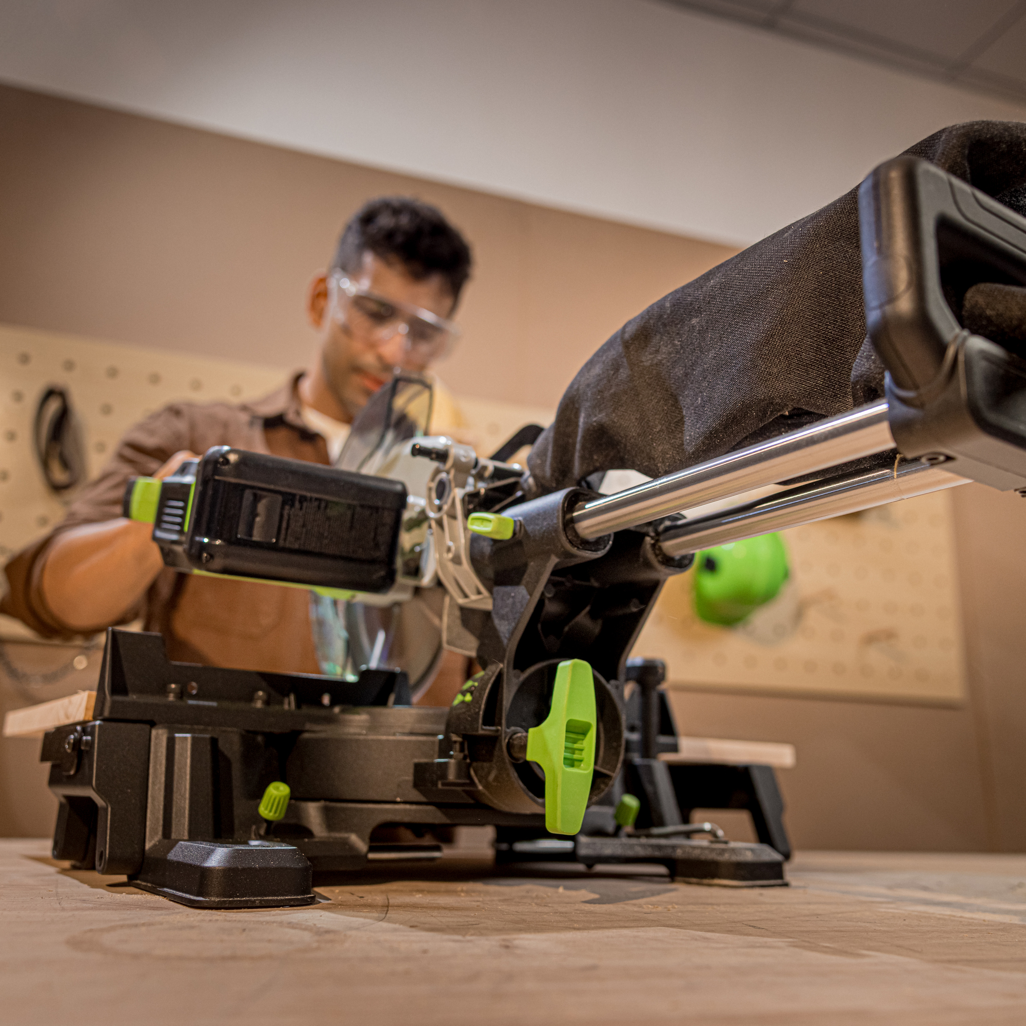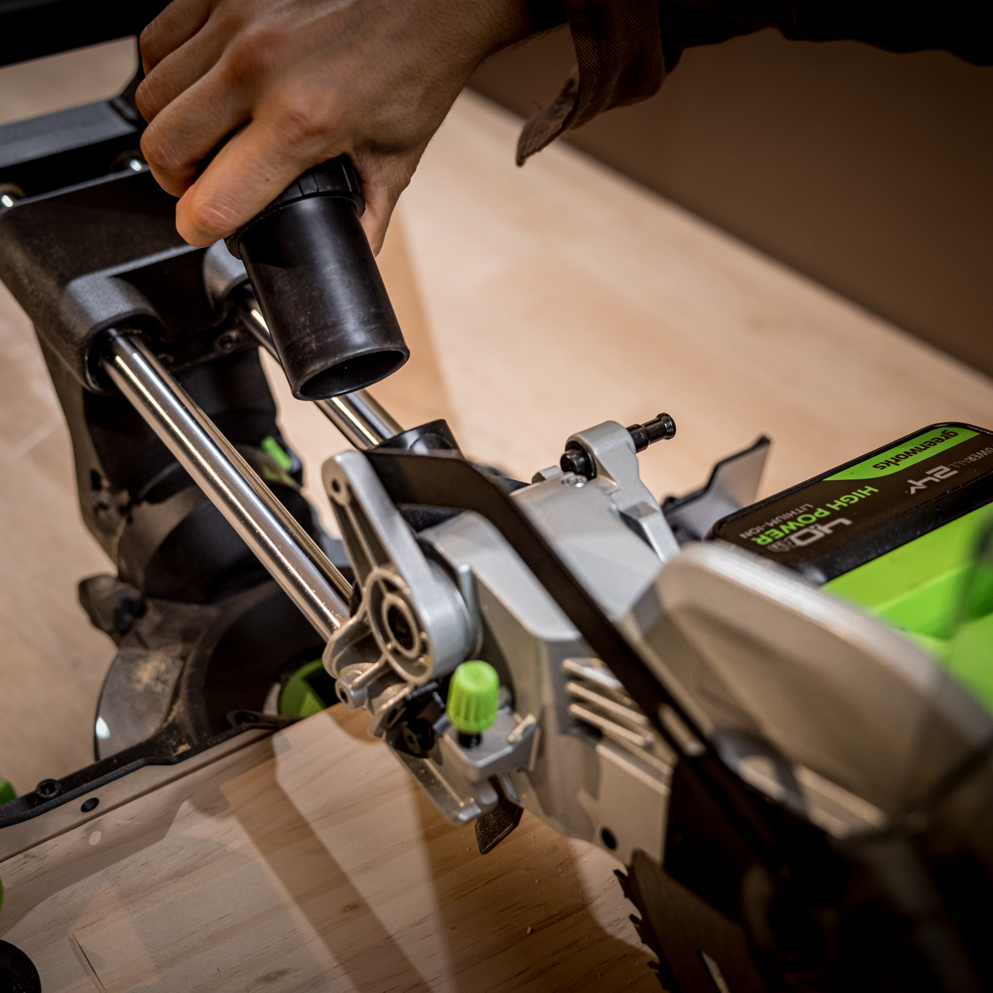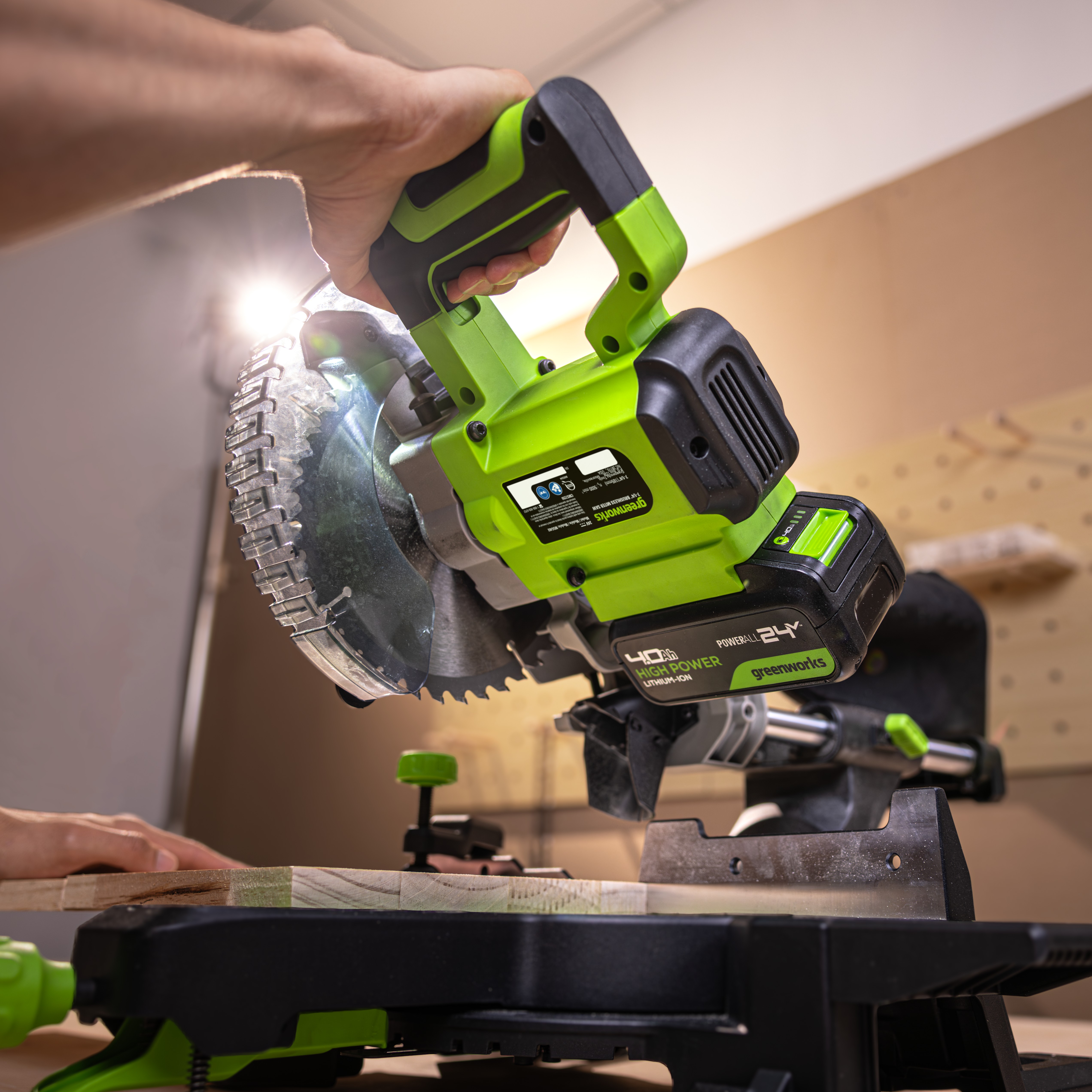 Плавный пуск, защита от перегрева / от перегрузки и защита от заклинивания пильного диска обеспечивают безопасность и длительный срок службы торцовочной пилы Greenworks GD24MS216.