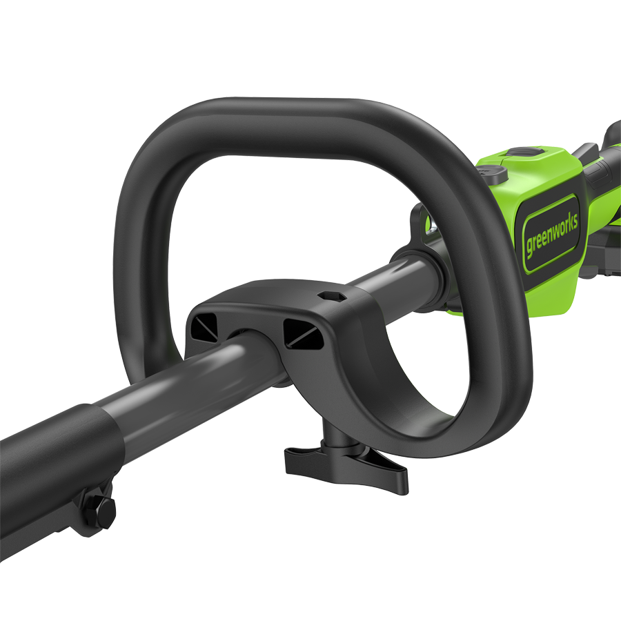 D-образная рукоятка триммера удобна для маневра в условиях ограниченного пространства. Рукоятка регулируется под рост оператора перемещением вдоль штанги триммера. Входящий в комплект поставки наплечный ремень позволит разгрузить руки оператора.