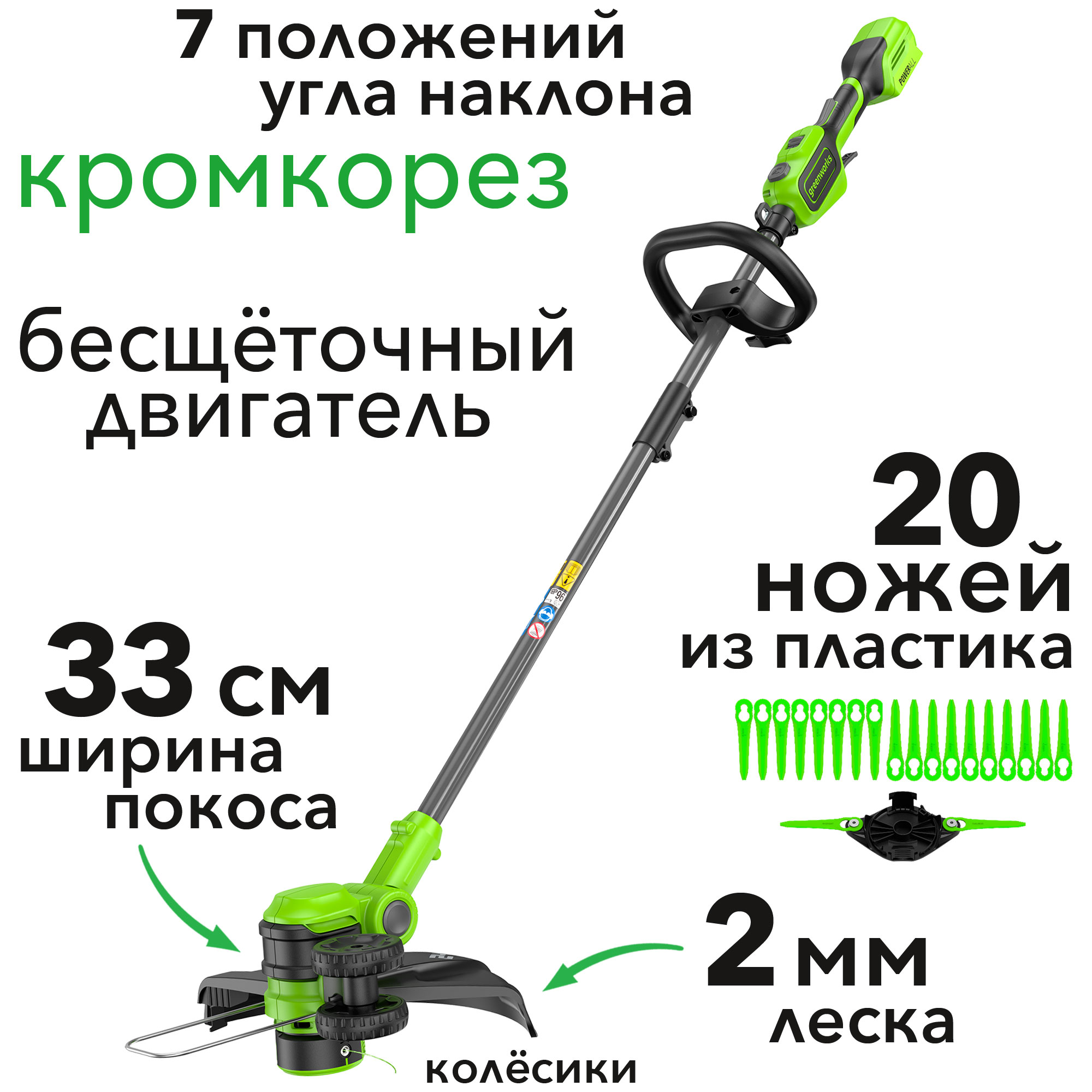 Триммер аккумуляторный Greenworks GD24LT331, 24V, 33 см, без АКБ и ЗУ (2113407) – легкий и достаточно мощный – отличная замена электрическому инструменту, его главное преимущество – автономность. Устройство 2-в-1 – садовый триммер и кромкорез.