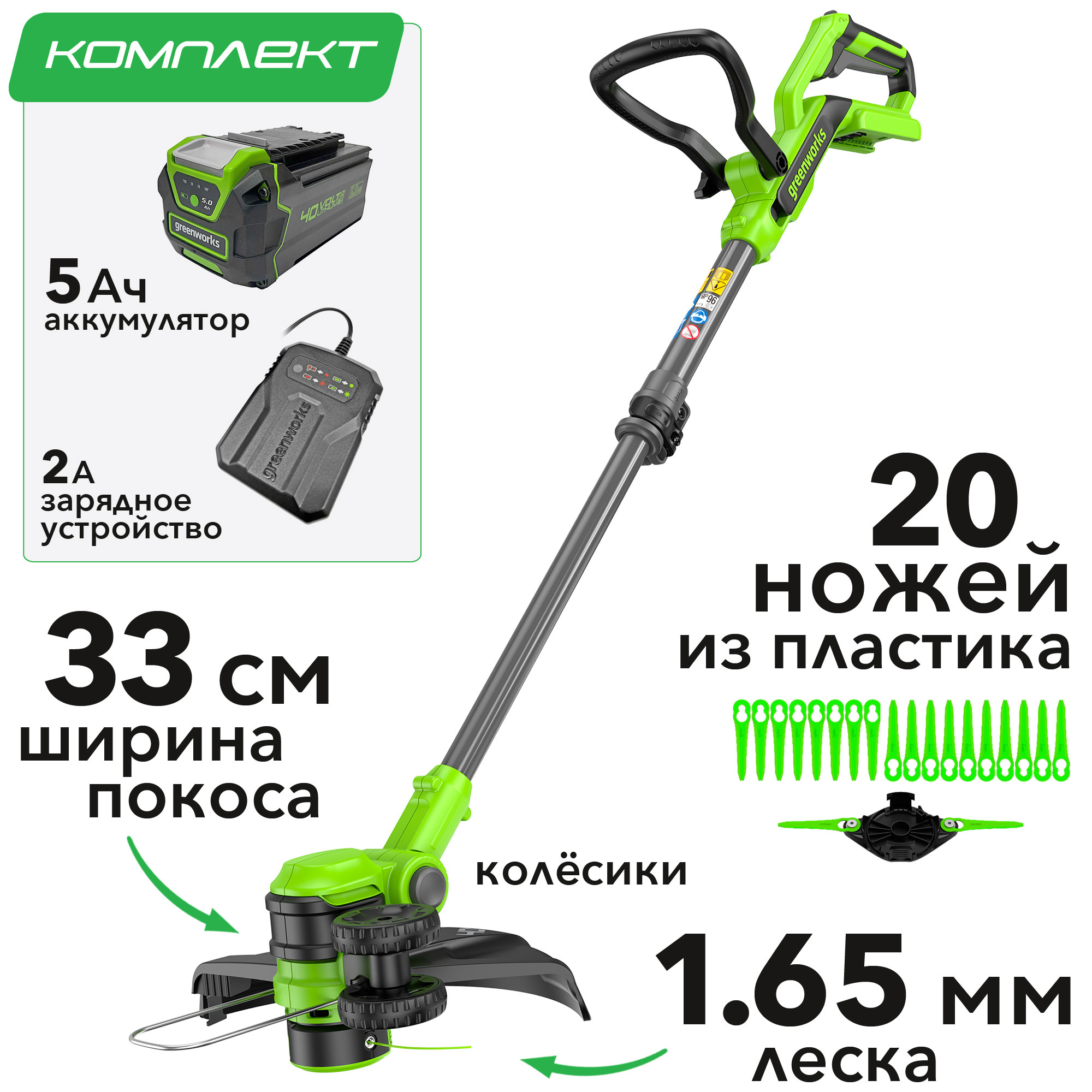 Триммер 33 см аккумуляторный Greenworks 40V G40LT331 (арт. 2113507) – легкий и мощный инструмент для сада, отличная альтернатива электрическим инструментам. Его главное преимущество – полная автономность, что позволяет работать без ограничений, связанных с проводами. Устройство сочетает в себе функции садового триммера и кромкореза, делая его универсальным помощником для ухода за газоном.