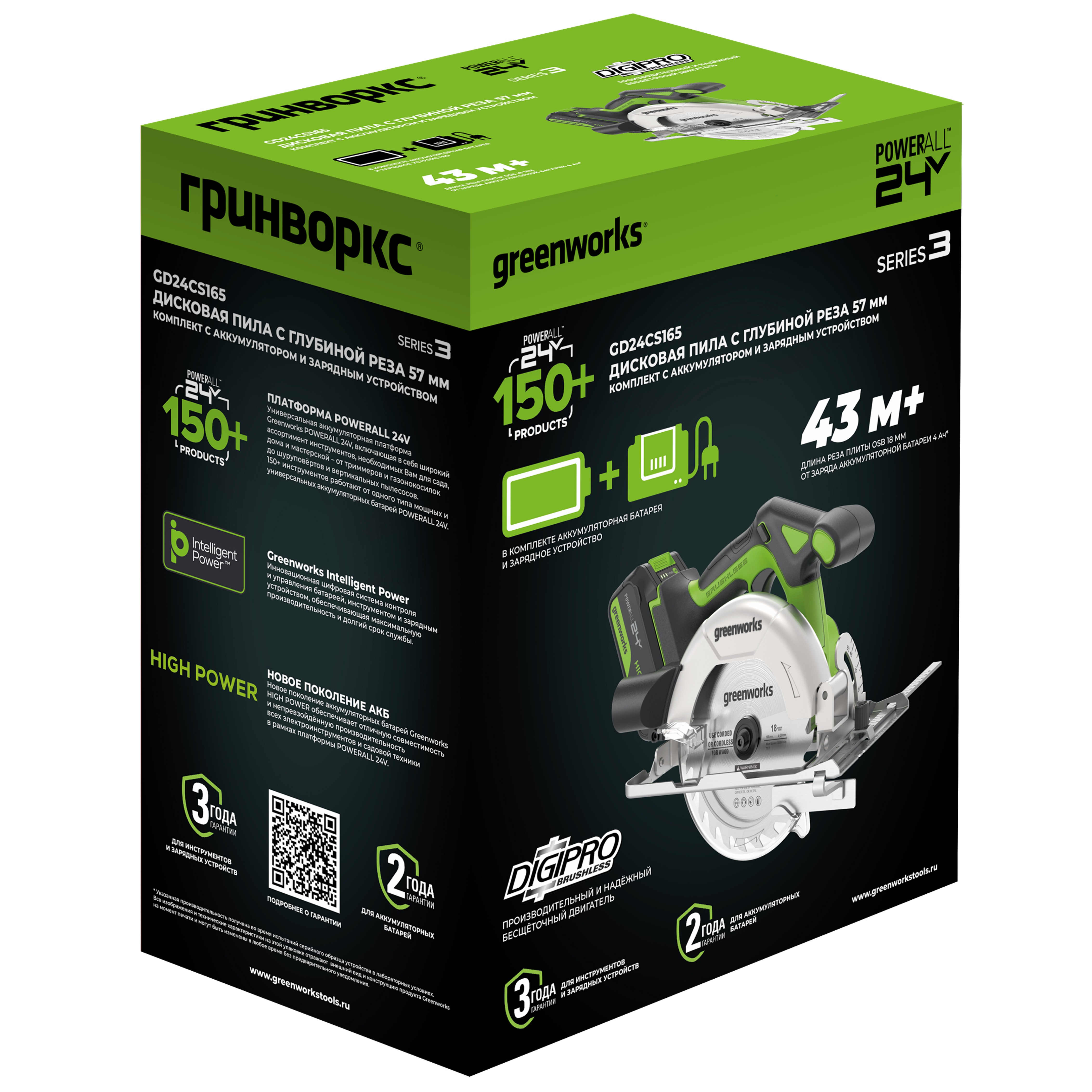 Циркулярная пила Greenworks GD24CS165 24V 1501607 бесщеточная аккумуляторная — циркулярная пила из серии 24V для распила всех видов древесины.