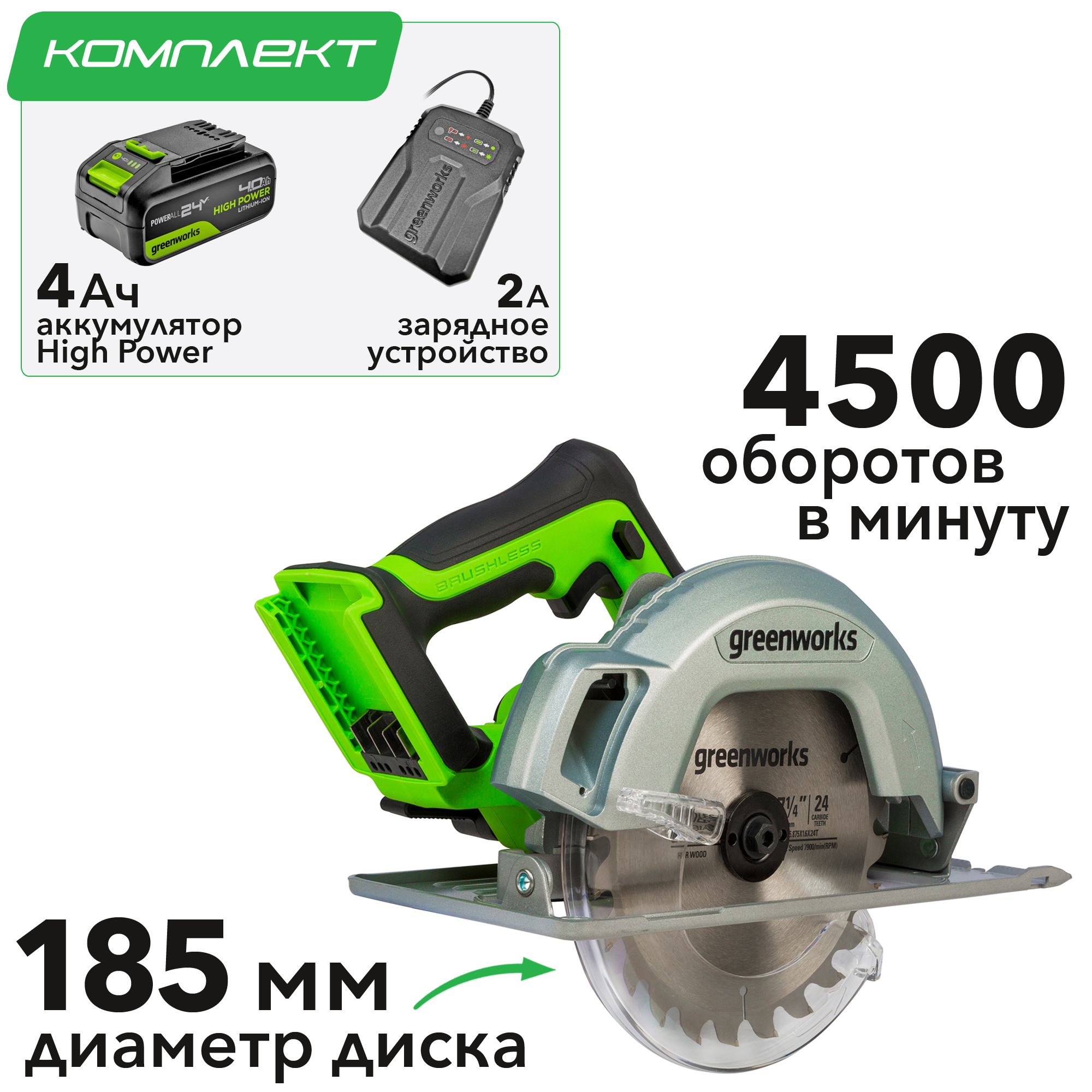 Благодаря работе от 24 В аккумулятора Greenworks, циркулярная пила обеспечивает долгую автономную работу, а так же этот аккумулятор подходит для остальных устройств из линейки G-24.
